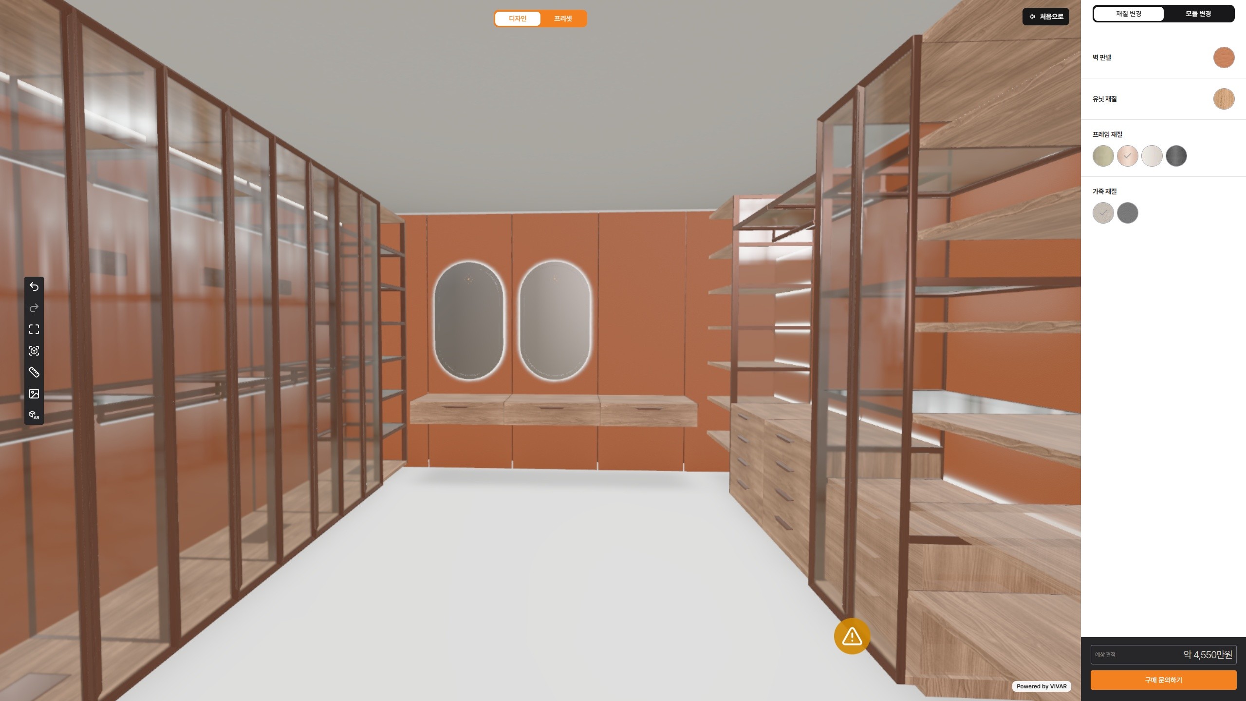 A high-end system dressing room configurator combining various storage modules, materials, and colors to create customized designs matching spaces and lifestyles.
