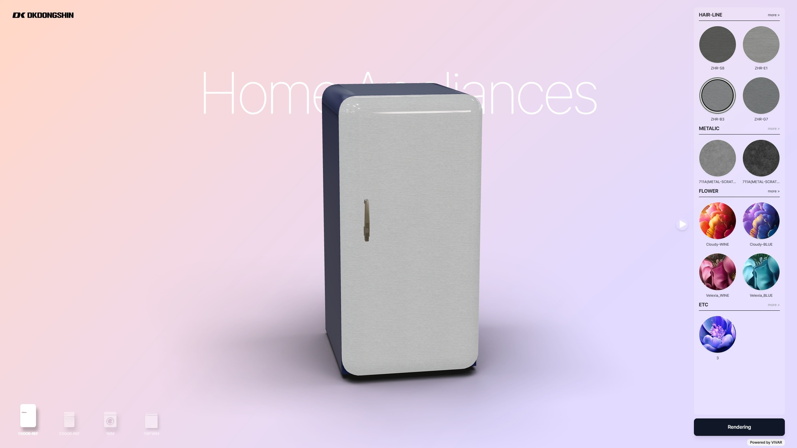 A 3D configurator for home appliance exterior panels. Sales teams can instantly visualize and compare various material, pattern, and color combinations for refrigerators, washing machines, and dishwashers.