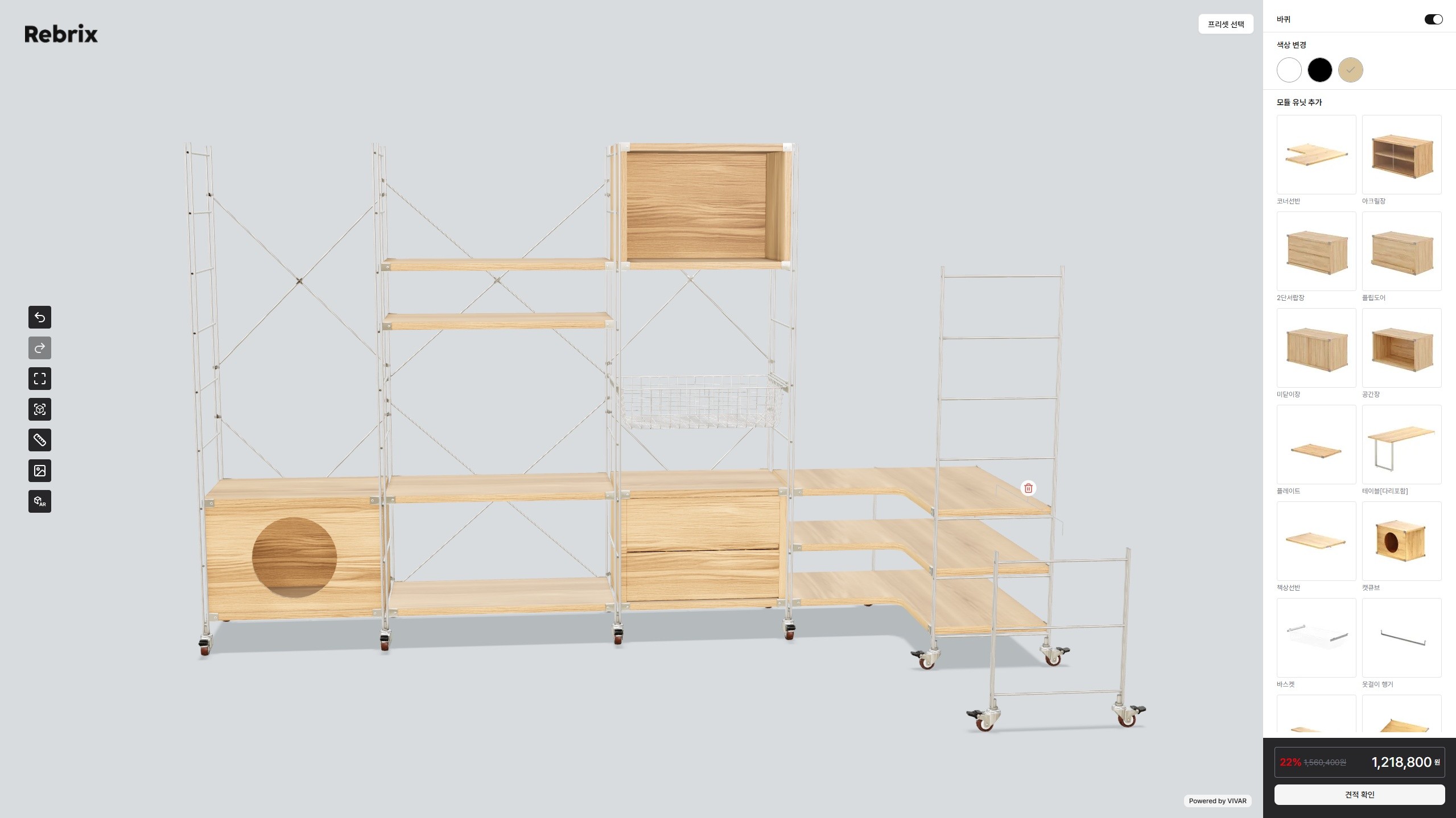 An infinitely expandable modular shelving system with clear rules. Users can easily configure products through an intuitive interface with rails and customizable modules.